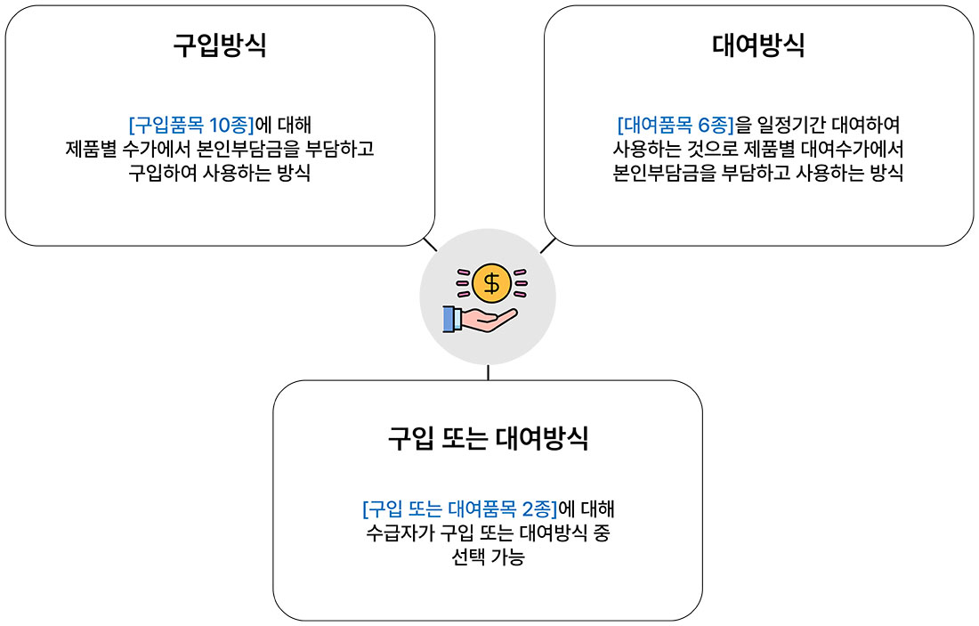 - · 내구연한이 정해진 품목은 재료의 재질·형태·기능 및 종류를 불문하고 내구연한 내에서 품목당 1개의 제품만 구입·대여 가능 (단, 성인용보행기는 2개까지 구입 가능)